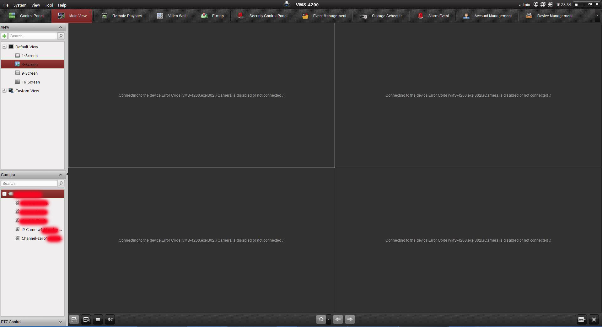 I have also attached an image of what my interface looks like on my pc with camera names etc. hidden.. Obviously there are error codes where the cameras should be. I only have three cameras, one of them being a PTZ which I can manipulate once I have double clicked on that camera and then clicked on the PTZ icon. iVMS front screen.JPG