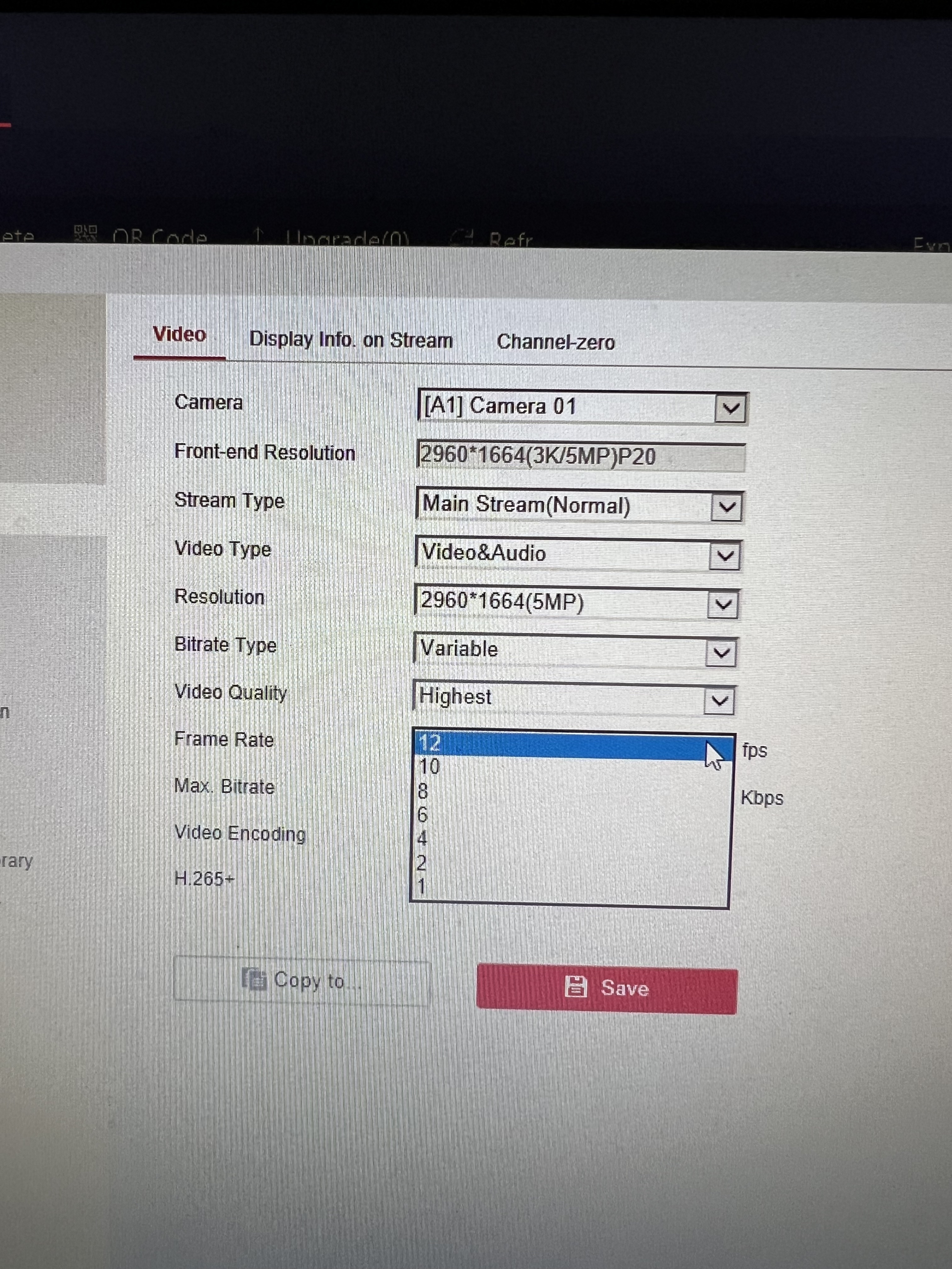I have this DVR. Hikvision ids-7208huhi-m1/s. and I can't increase the FPS in the main stream no more than 12fps. And 20fps maximum to the sub-stream. How can I achive at least 25fps o 30fps. Since the cameras support 30fps.