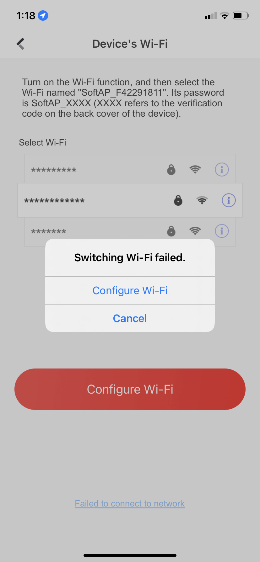 When i try to do the configure manually option it says “Turn on the Wifi function, and then select the Wi-fi named SoftAP_F42291811(XXXX refers to the verification code on the back of the device).”