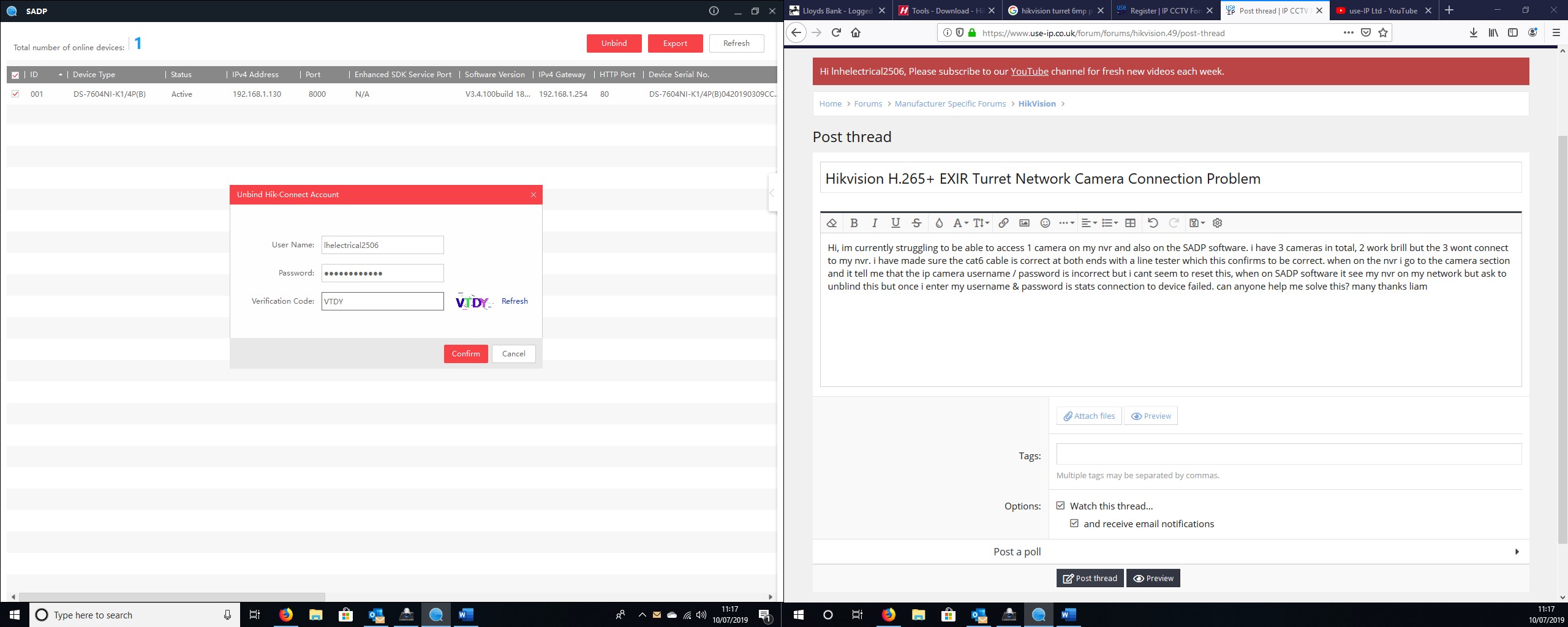 Hi, im currently struggling to be able to access 1 camera on my nvr and also on the SADP software. i have 3 cameras in total, 2 work brill but the 3 wont connect to my nvr. i have made sure the cat6 cable is correct at both ends with a line tester which this confirms to be correct. when on the nvr i go to the camera section and it tell me that the ip camera username / password is incorrect but i cant seem to reset this, when on SADP software it see my nvr on my network but ask to unblind this but once i enter my username & password is stats connection to device failed. can anyone help me solve this? many thanks liam