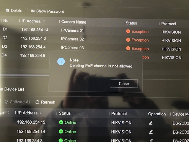 The POE cameras get picked up and work correctly if I connect them up directly to the NVR ports. But if I connect the cameras to a network switch which is connected to the router, I am facing an issue. The NVR is picking up the cameras in the 'Online Device List' (screenshot), but I am unable to add them to the "Added Devices list", if I do try and delete the devices from this list, I get a message 'Deleting PoE channel is not allowed'. (screenshot).