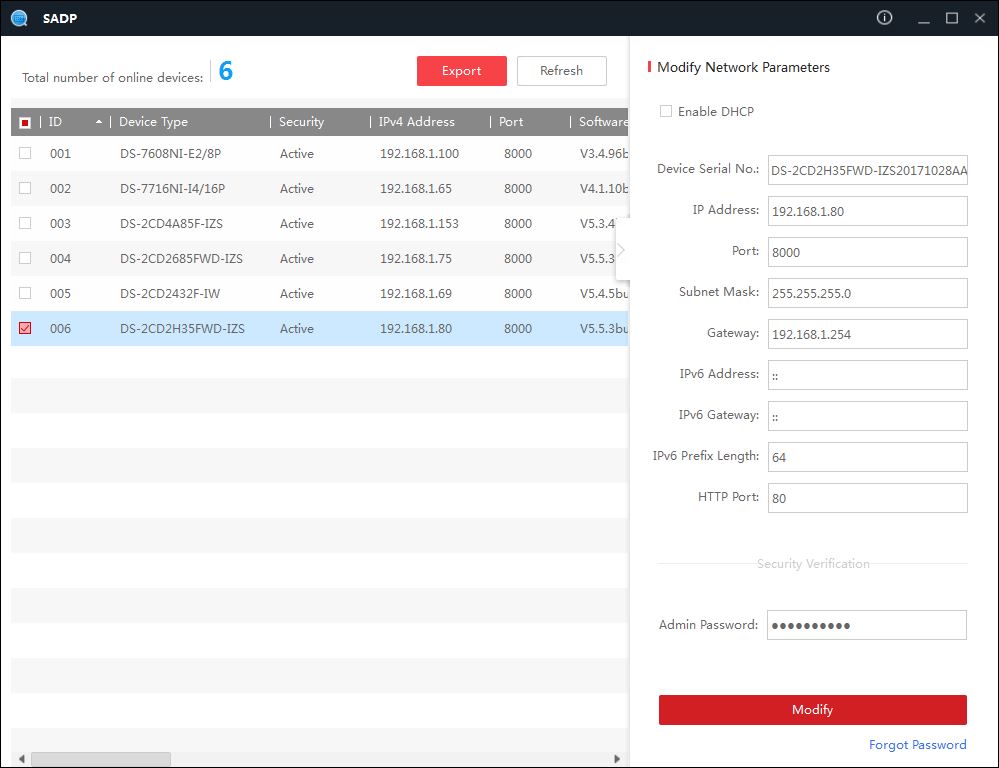 Step 2: Open SADP and select the camera (tick the box on the left of the list) then change the IP address of the camera to Milesight's default PoE segment (192.168.20.xxx), enter the admin password and click Modify