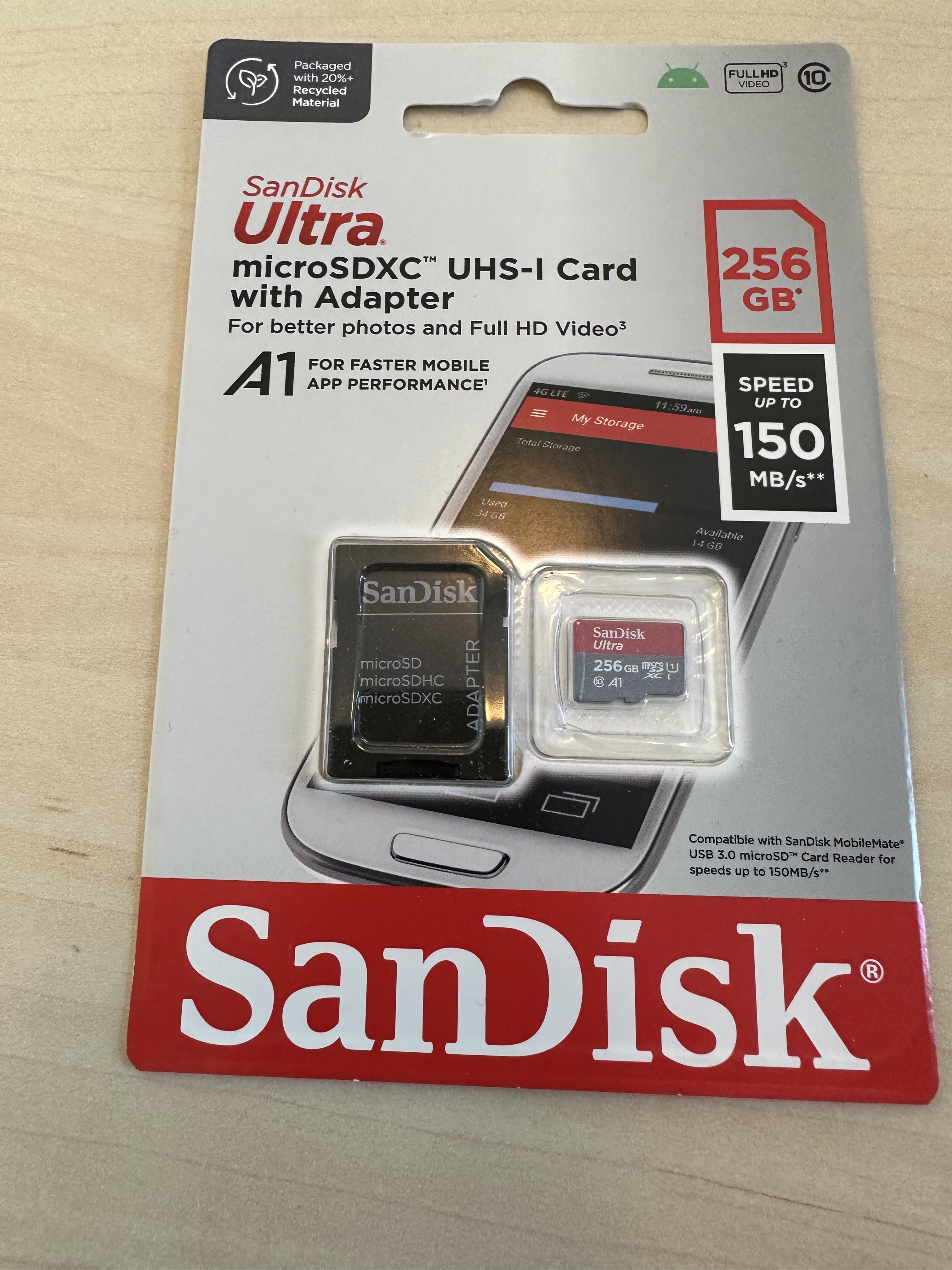 The card should be placed in a slot under the camera, but I am afraid to do it wrong. The camera can use these: Built-in micro SD/SDHC/SDXC slot, up to 256 GB and I just bought a Scandisk ultra microSDXC UHS-I Card as shown on a picture. The other picture show the slot.