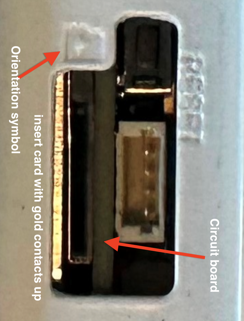 If you look at the length of the slot, the narrowest part of the card must probably point down/in, but should the side of the card shown up in the picture be down towards the white paper - or vice versa?