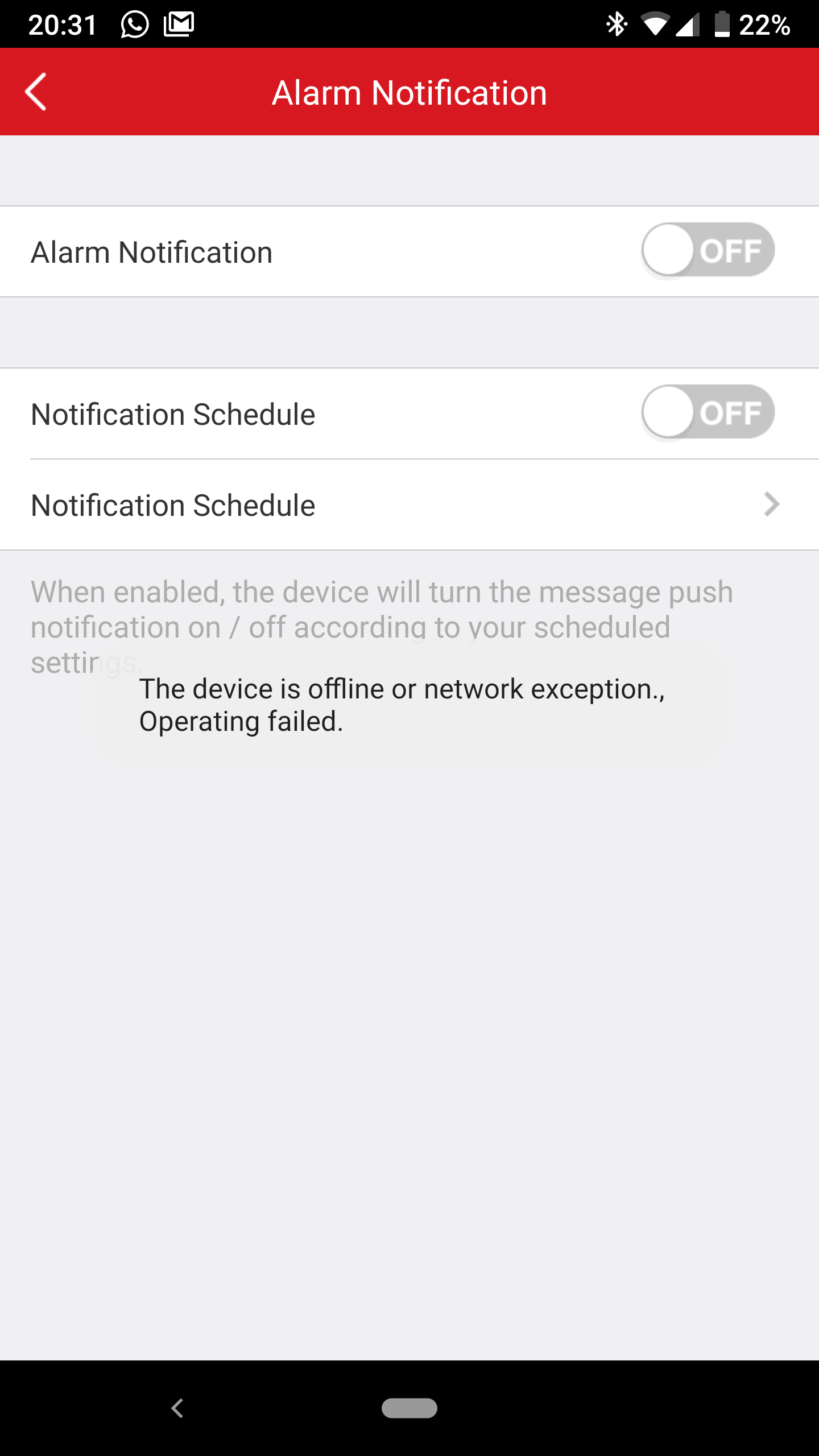 If I go into the settings for my NVR (within the Hik-Connect App) and try and enable or disable Alarm Notifications, I get the error in the attached screenshot. I also get the same issue if I try and enable/disable Notification Schedules or edit the Schedules. I find that once the error occurs, the NVR shows as offline for 10-30 seconds - I can also see the NVR itself going offline (it looks to be rebooting). Looks to me like there's an incompatibility between the NVR and the new Hik-Connect app version which causes the NVR to crash & reboot whenever I try and do anything with Notifications.