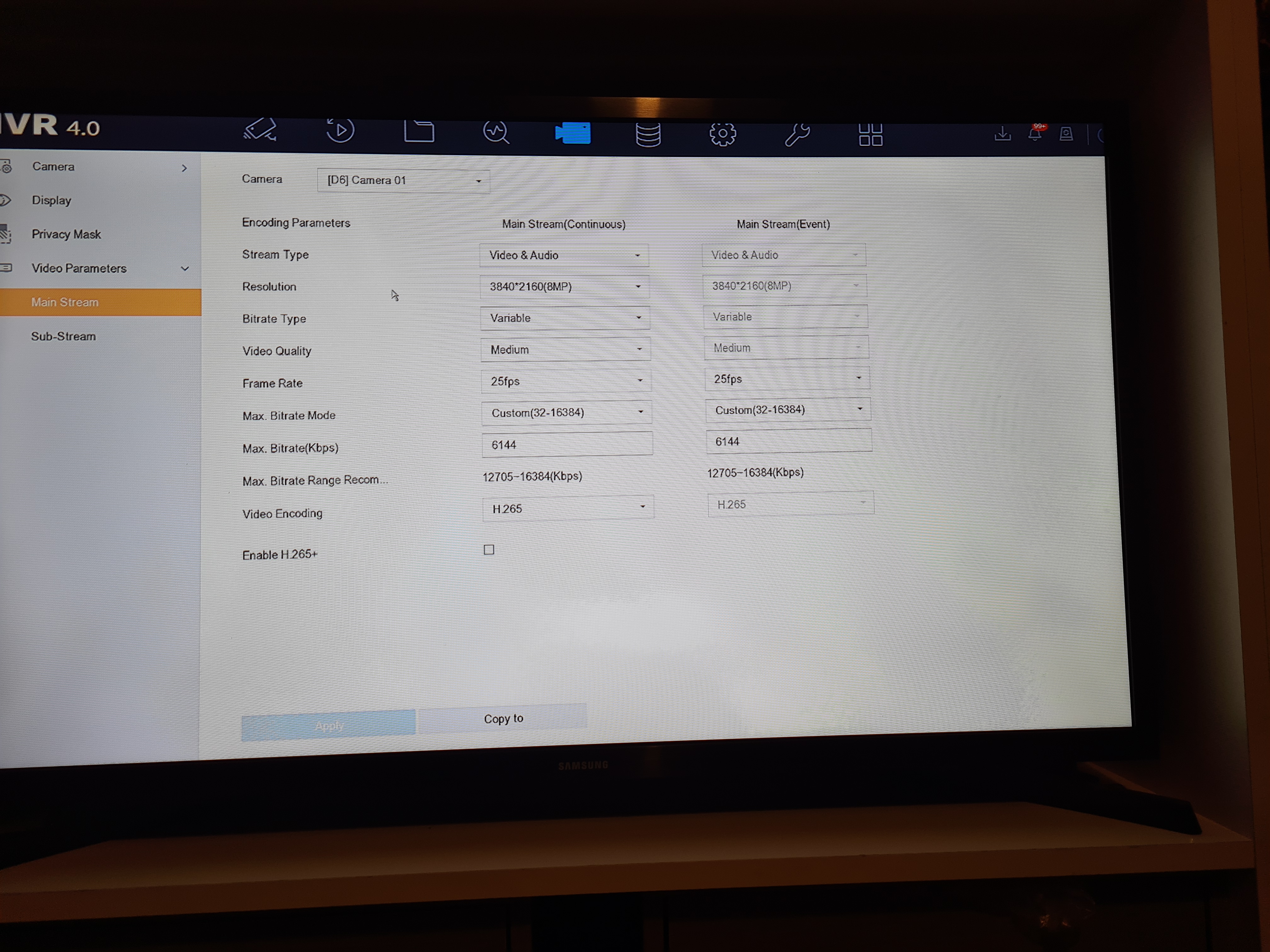 Main stream normal and main stream event should always match - which they do. However you've got the bit rate on 6144 which is below Hikvisions recommended value of 8192. From memory mine is set to 10240.