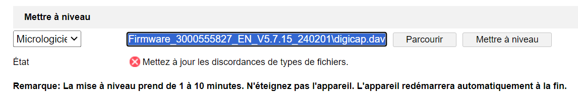 This camera worked well by then, I tried to update its firmware using the firmware from the official global site and then a firmware provided by Hikvision support team and I received the error: "File mismatch" as if there was a language issue.