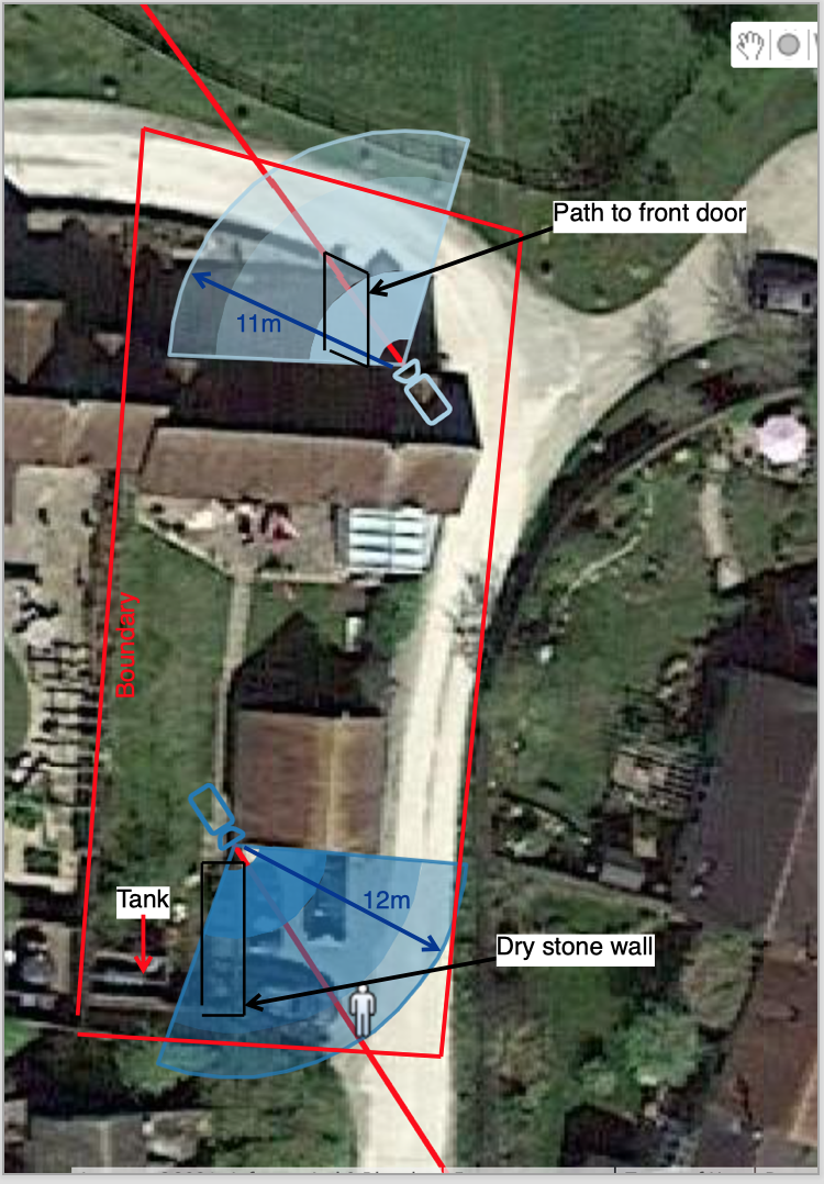 The rear camera would be South facing, 2.5m high and directly above the garden gate. Covering the garage and driveway and access to the oil tank, again good resolution to 11 or 12m, and the two way talk would be good for deliveries.