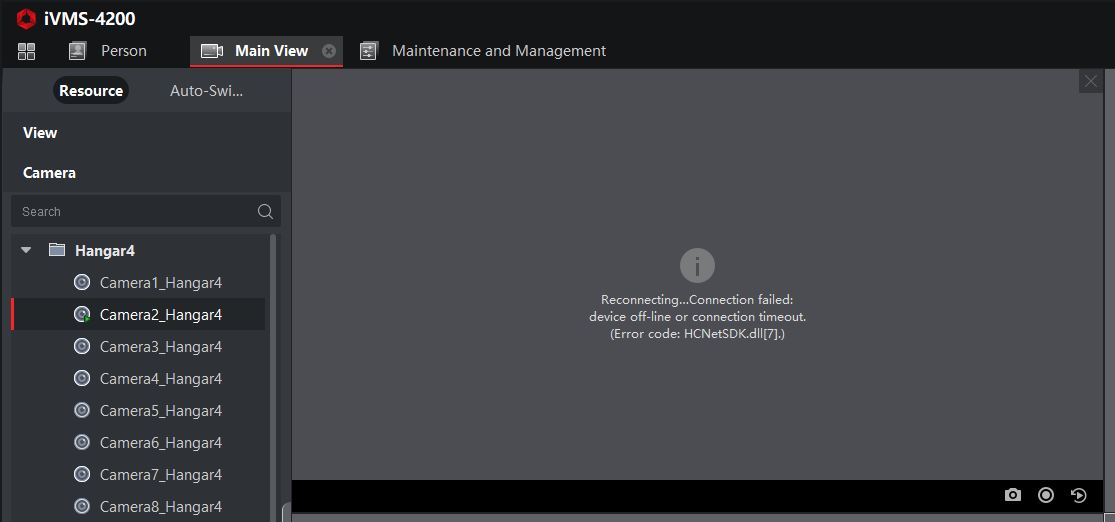 I have the latest VMS-4200 software, and have connected my cctv camera units to it using credentials that I know work correctly as they allow live feed to other computers VMS4200 installs on our network. I have used the super user account which has full permissions to all the categories available to give permissions for. I connect the cctv unit and it shows as connected with a green icon. I can import the cameras and when I go to main view, I can see the cameras. When I click on a camera, it displays a small green play icon, but when I try and view the live feed itself, it gives me a black screen. The error I get is in the attached screenshots. The machine I have installed it on is a laptop running Windows 10. I have tried the same setup on another laptop of the same make, but I get the same blank video screen. If I leave it for a while the video screen gives the error "Reconnecting...Connection failed:device off-line or connection timeout. (Error code: HCNetSDK.dll[7]) Can someone please help me to see live video from this software?