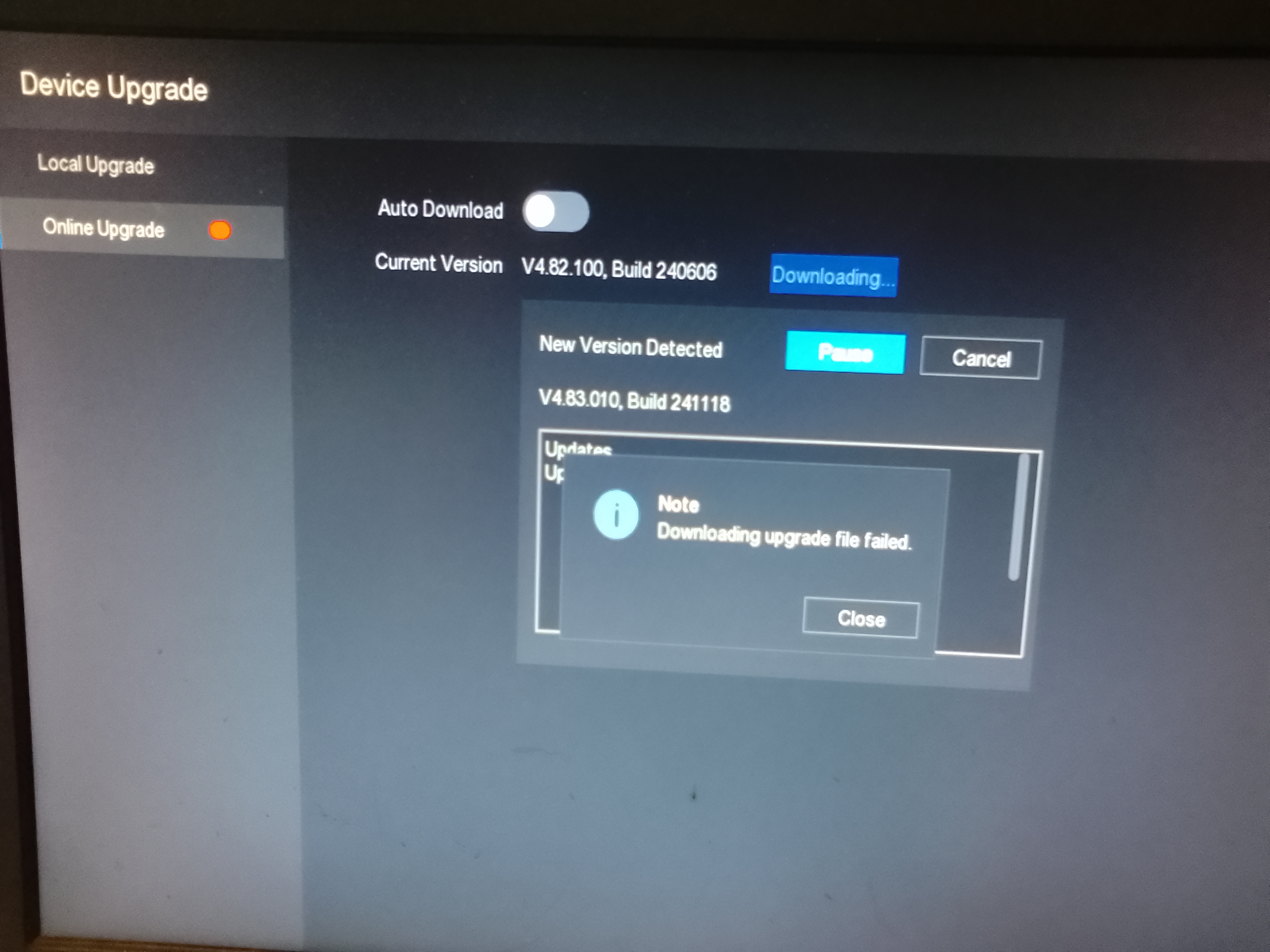I'm trying to do the online update through the NVR but getting this message in pic below.