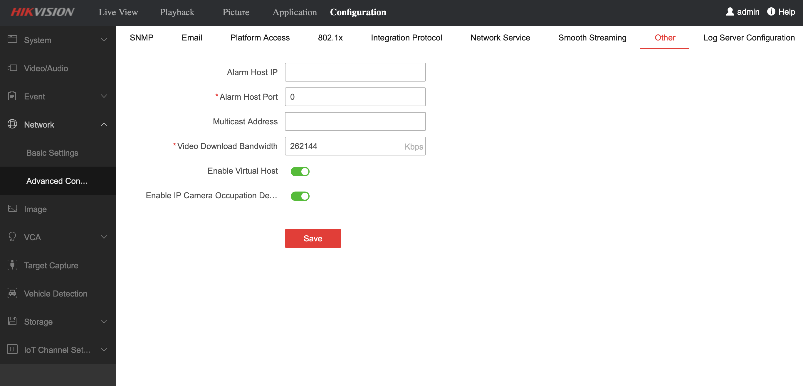 The cameras have to be updated by navigating to their individual webpage. If you login to your NVR with a web browser using its IP address as previously mentioned, you want to make sure "Virtual Host" is enabled in the configuration (has to be activated while logged in from web browser as it's not available on the TV/monitor menu output). You'll find the setting in Configuration > Network > Advanced > Other as shown below: