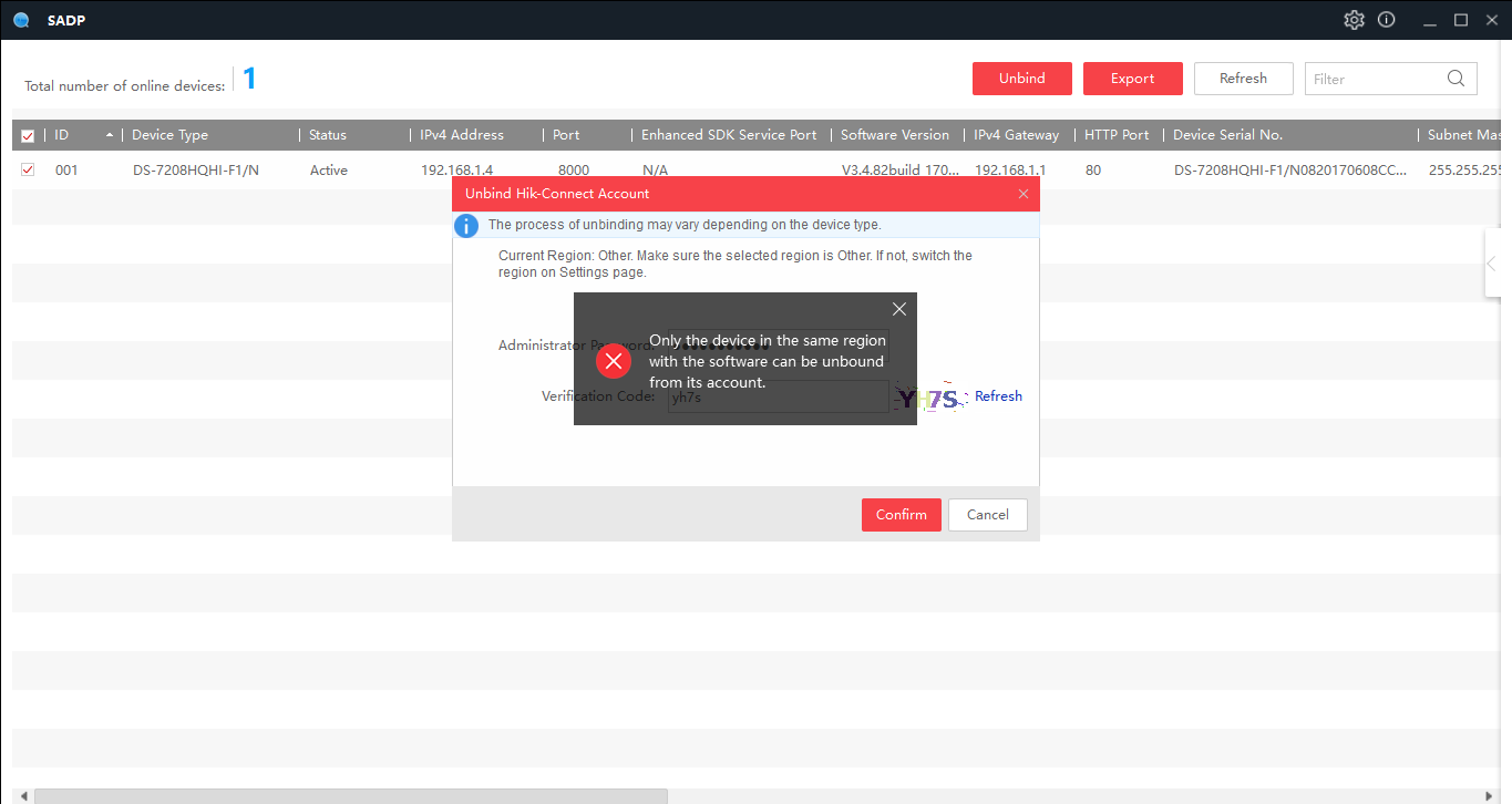 "Only the device in the same region with the software can be unbound from this account."