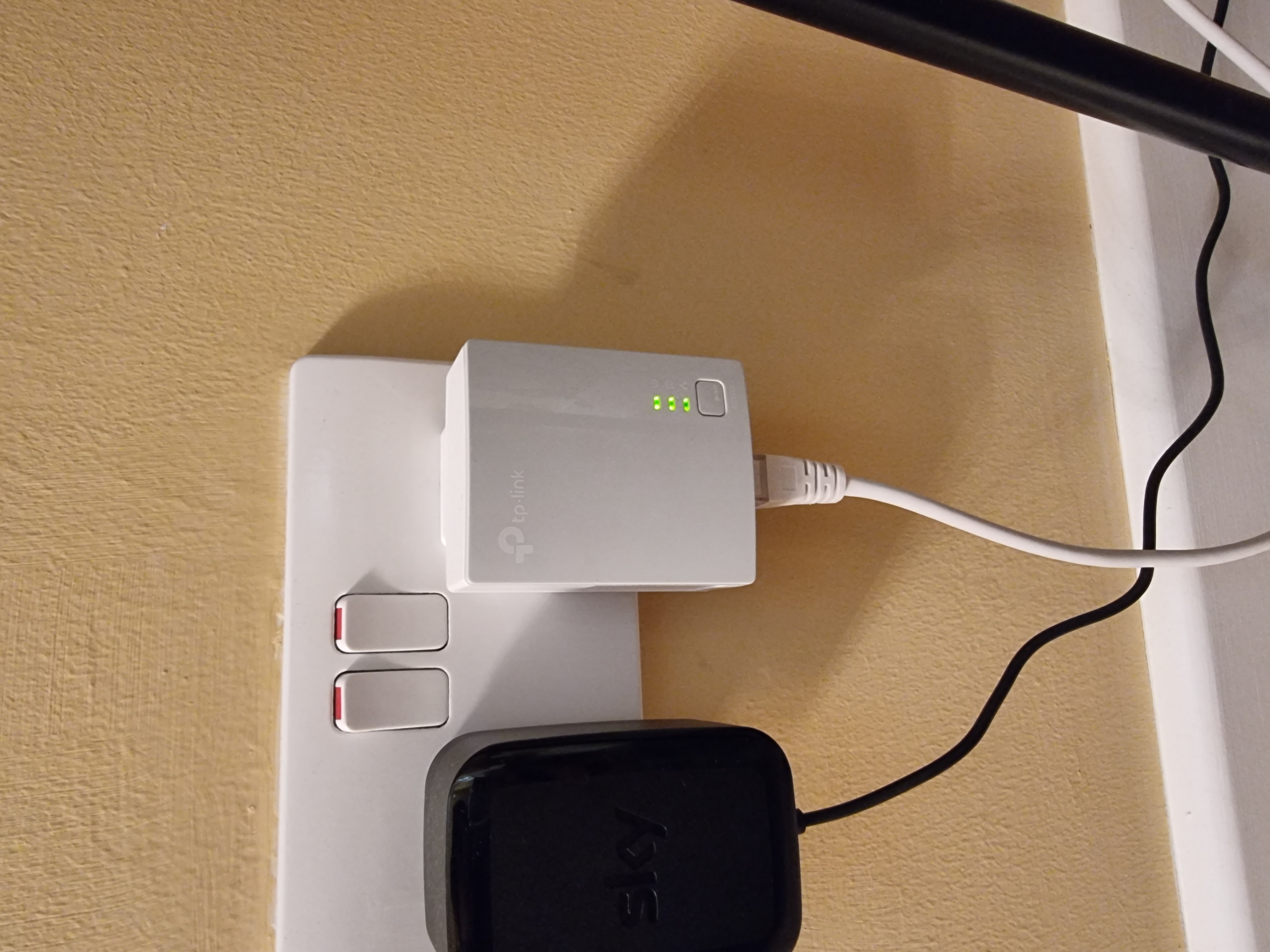The black plug is for the router and the other TP link upstairs is plugged into a socket next to an extension lead with the nvr/printer/desktop plugged in.