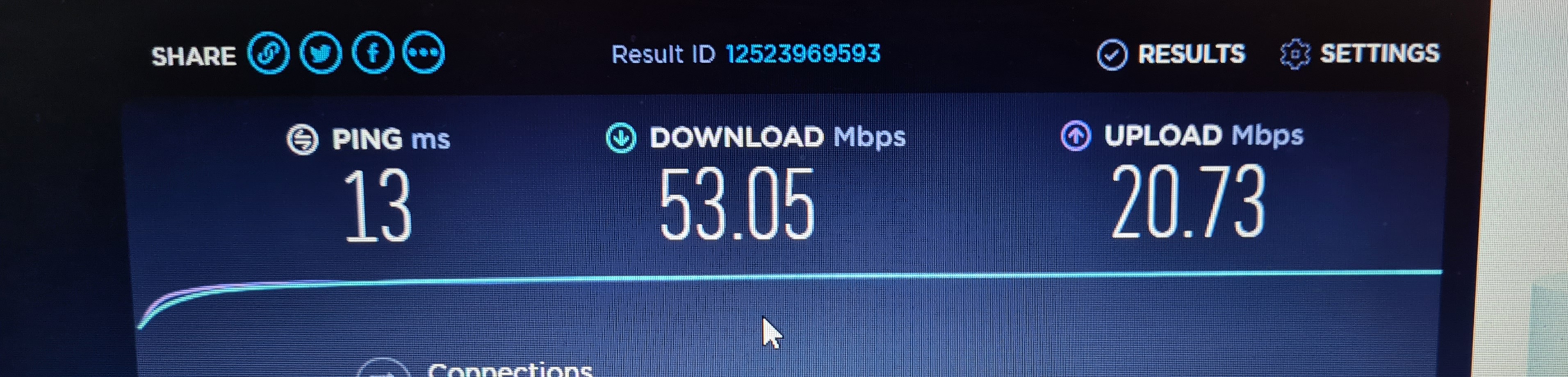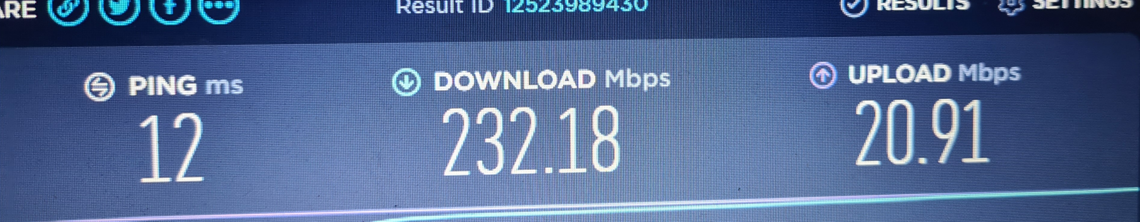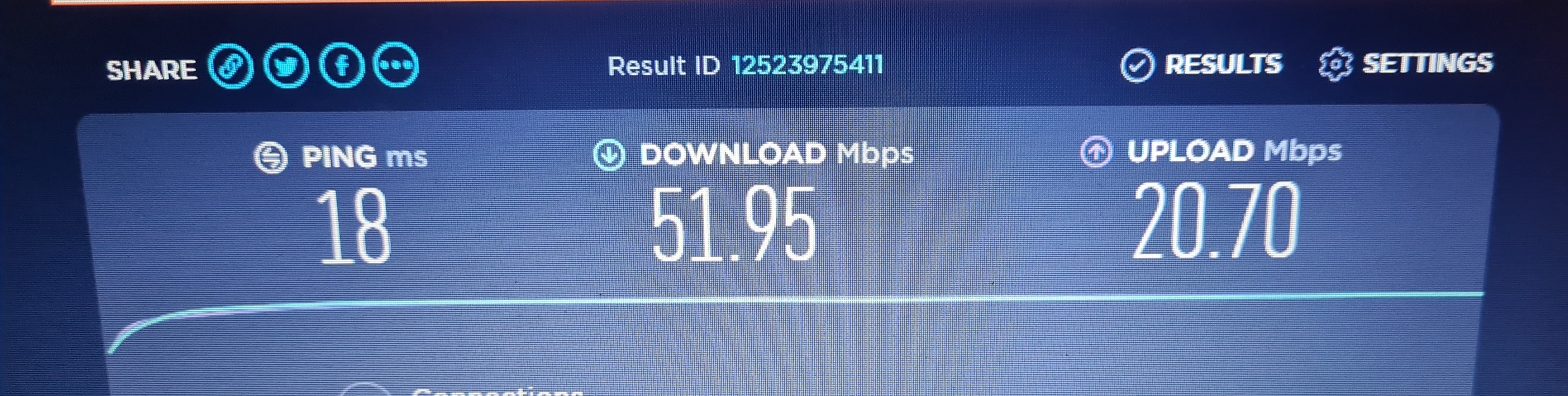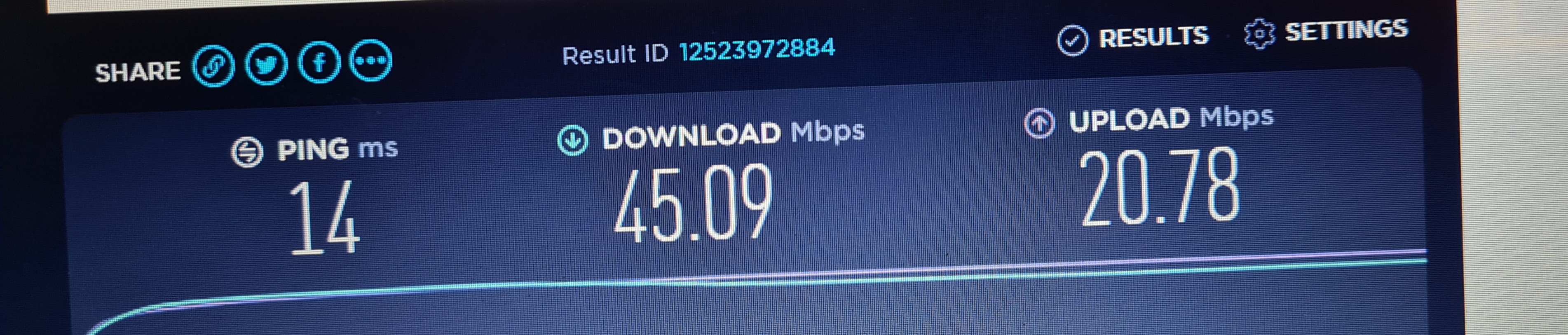 Repeated the test from the tp link and got 45 to 50 dl x3. Upl was 20.