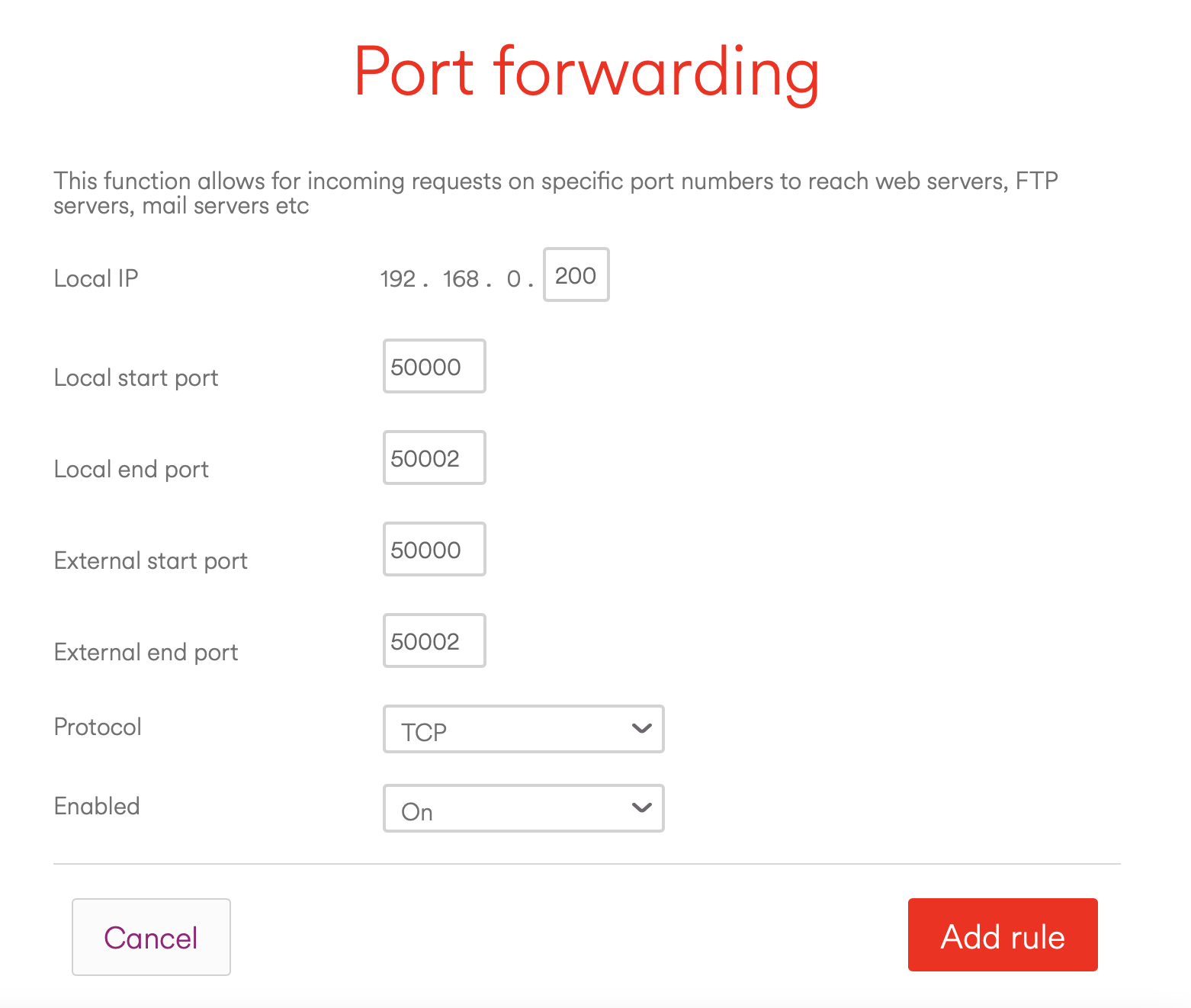 Click Create New Rule and fill in the boxes with the NVR IP address from earlier, the start and end ports for both local and remote, set the protocol to TCP and be sure to select Enable before clicking Add Rule. The picture below shows it using the IP and ports set in the NVR. If you had left your ports at default; you would need to add 3 rules one for port 80, one for 8000 and one for port 554. Some routers allow you to add a number of non consecutive ports to a rule by listing the numbers with a comma between them, but the VM Hub does not. For that reason I always set 3 consecutive ports as standard on all installations regardless of router model.