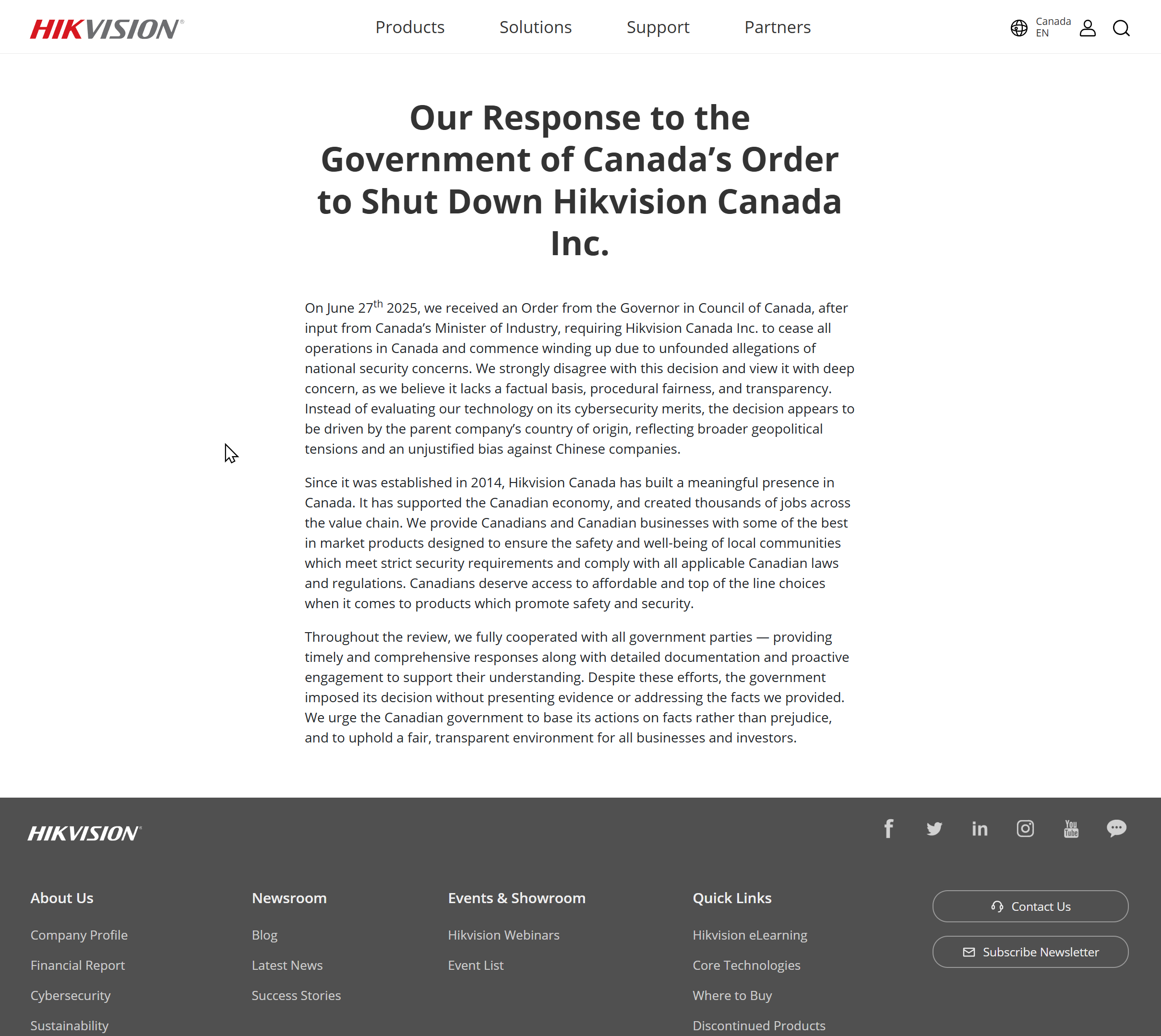 On June 27th 2025, we received an Order from the Governor in Council of Canada, after input from Canada’s Minister of Industry, requiring Hikvision Canada Inc. to cease all operations in Canada and commence winding up due to unfounded allegations of security concerns. We strongly disagree with...