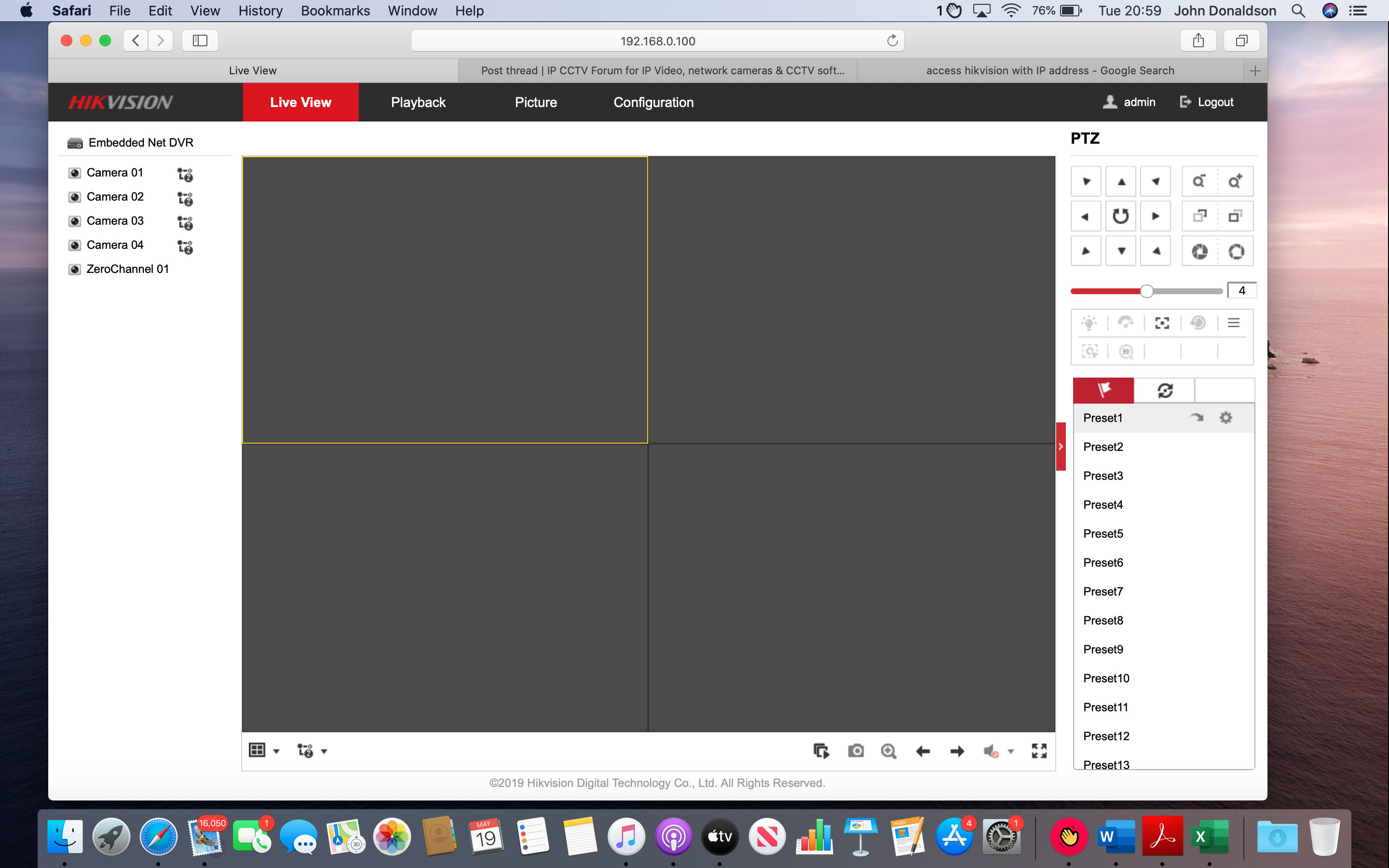 2) I can access my system on my laptop via the IP address and can view/amend/change all the settings - the one problem is I can't see any footage (live or prerecorded). The four boxes are all blank. The names of my 4 cameras are showing on the left hand of the screen and are selected, but I can't see any footage (see attached pic). Is there a setting I need to initiate?