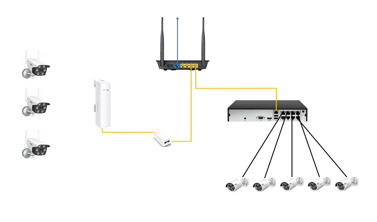 The WiFi cameras are far away, so they communicate via an Outdoor Wireless Access Point. This Outdoor Wireless Access Point is connected to the second port of the second wifi switch with a cable.